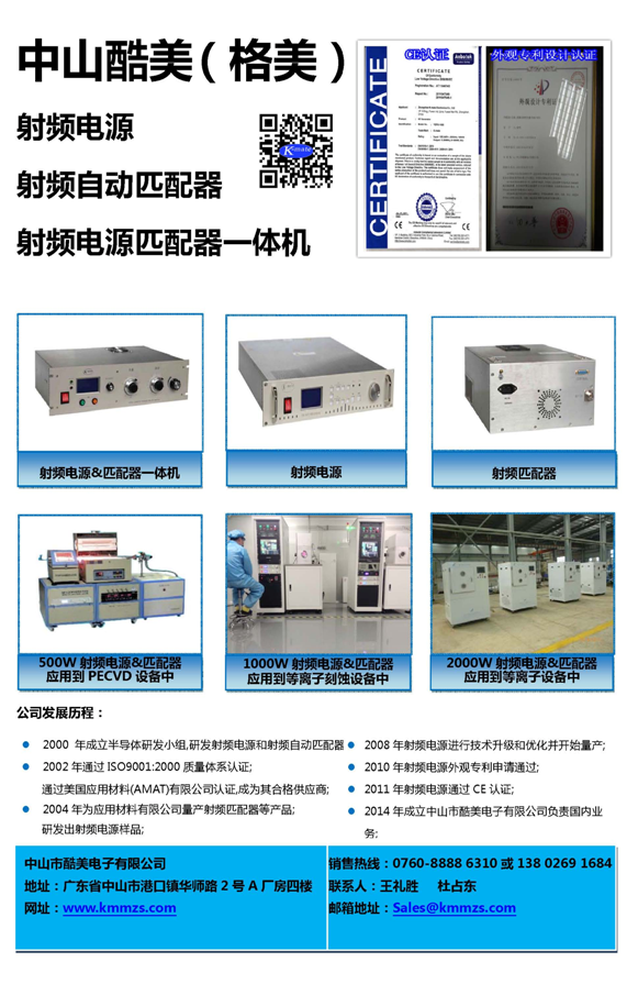 中山市酷美電子有限公司是一家專業(yè)從事半導體制造設備研發(fā)、設計和制造的高科技合資企業(yè)。產(chǎn)品主要有射頻電源、射頻自動匹配器、射頻功率分配器,廣泛用于太陽能光伏系統(tǒng)、PECVD、真空鍍鏌、刻蝕等真空設備當中。公司于2000年進入半導體領域,已有15年豐富的行業(yè)經(jīng)驗。2002年,成為全球最大的半導體設備制造商AMAT(美國應用材料公司APPLIED MATERIALS INC)認證的供應商,并為AMAT大批量制造射頻匹配器等產(chǎn)品,每年DMR比率控制在1%之內(nèi)。